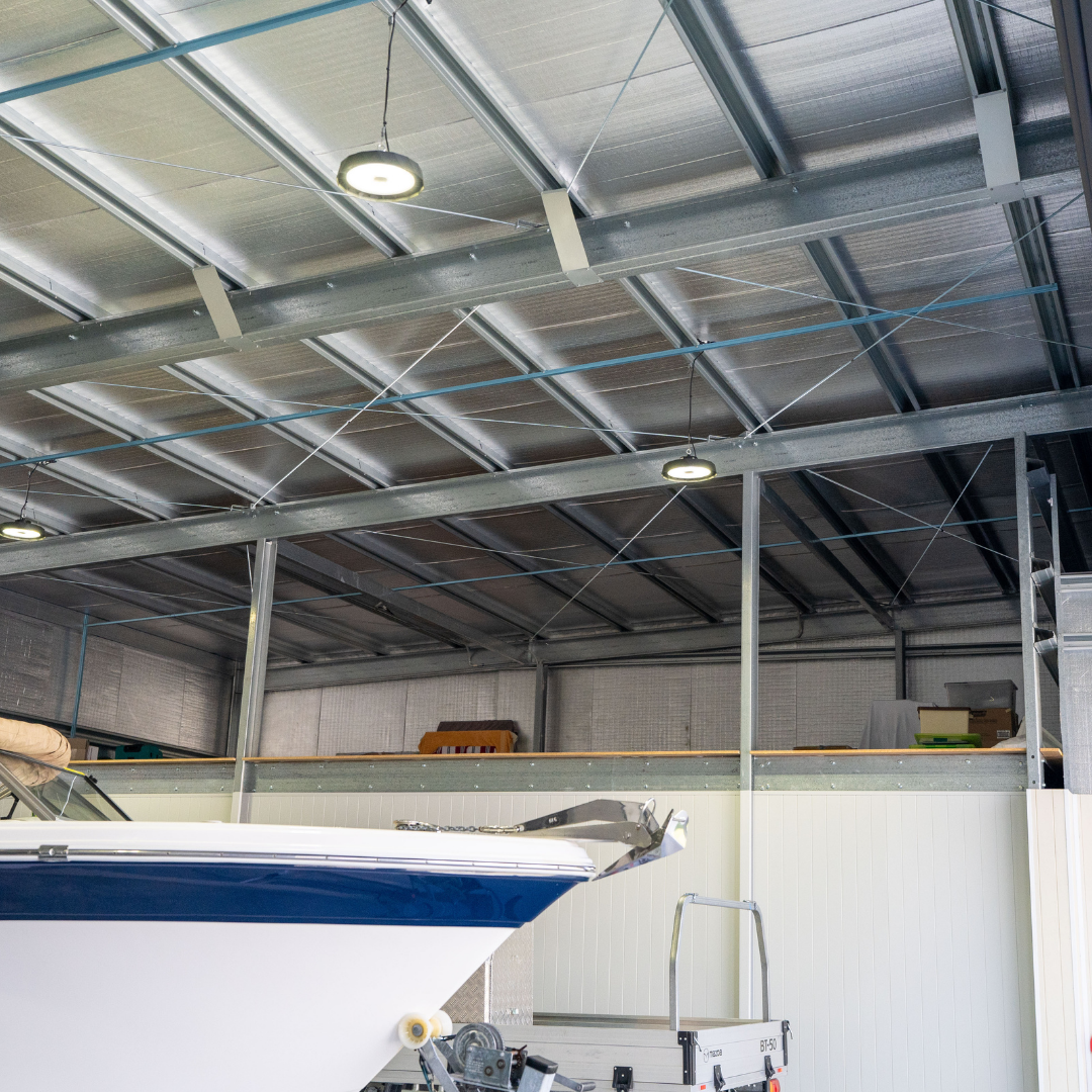 Make the most of your vertical space – add a practical mezzanine floor to your garage design to create additional storage or flexible utility space above. Ideal for keeping equipment, tools, or seasonal items organised without reducing valuable floor area.